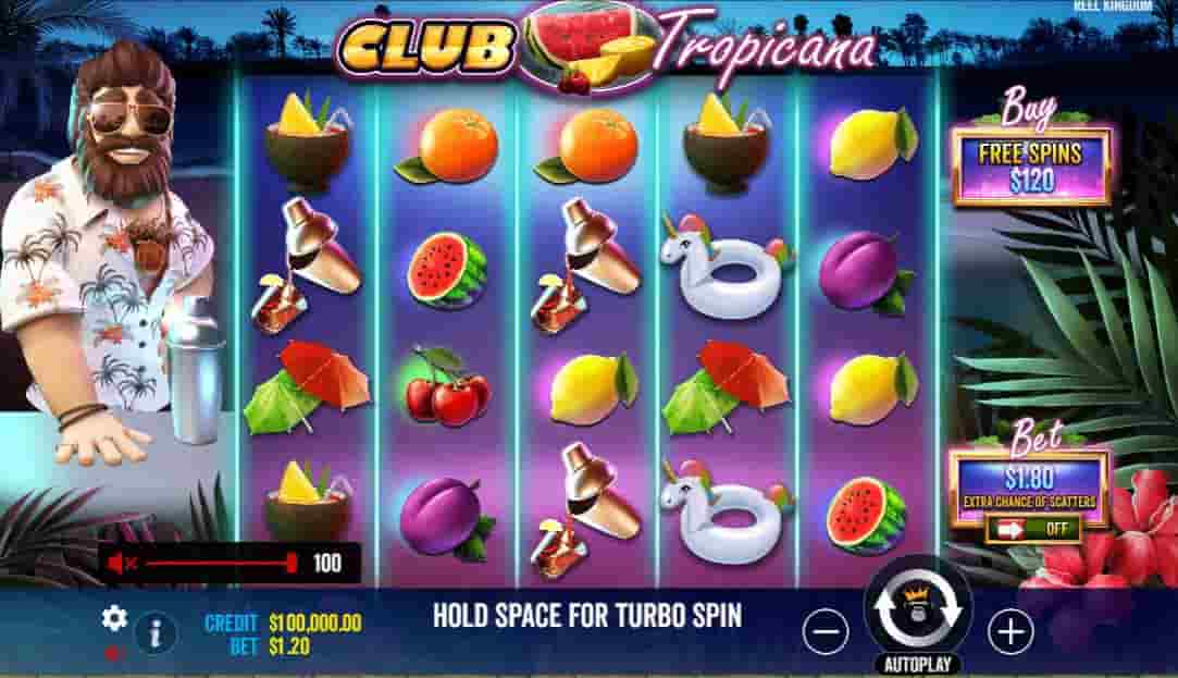 Club Tropicana slot es una atracción de juego con temática de vacaciones en la playa lanzada por Pragmatic Play en 2023. El juego transporta a los jugadores a un paraíso tropical donde les esperan cócteles refrescantes, playas soleadas y grandes premios. Uno de los principales atractivos de la tragamonedas es su juego repleto de bonificaciones. Los jugadores pueden esperar tiradas gratis, símbolos de dinero y el uso poco convencional de comodines. Con un RTP del 96,08% y una ganancia máxima de 4.000x, Club Tropicana es una gran elección para los jugadores que esperan grandes pagos.